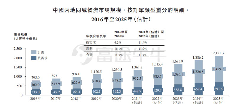 中国内地同城物流交易市场规模从2016年的人民币7950亿元增至2020年人民币1.23万亿元,预计2025年将增加至2.12万亿元,2021~2025年的复合增长率将达到11.7%。