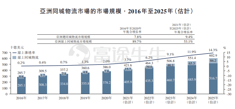 受经济发展推动,亚洲的城镇化率、电子商务渗透率及移动支付渗透率自2016年至2020年显著增长,预计未来仍将保持增长趋势。得益于上述因素,亚洲同城物流市场经历快速增长。按交易总额计,市场规模从2016年的2,857亿美元增至2020年的3,860亿美元,2016年至2020年的年复合增长率为7.8%,并预计于2025年进一步增长至6,029亿美元,2021年至2025年的年复合增长率为9.4%。