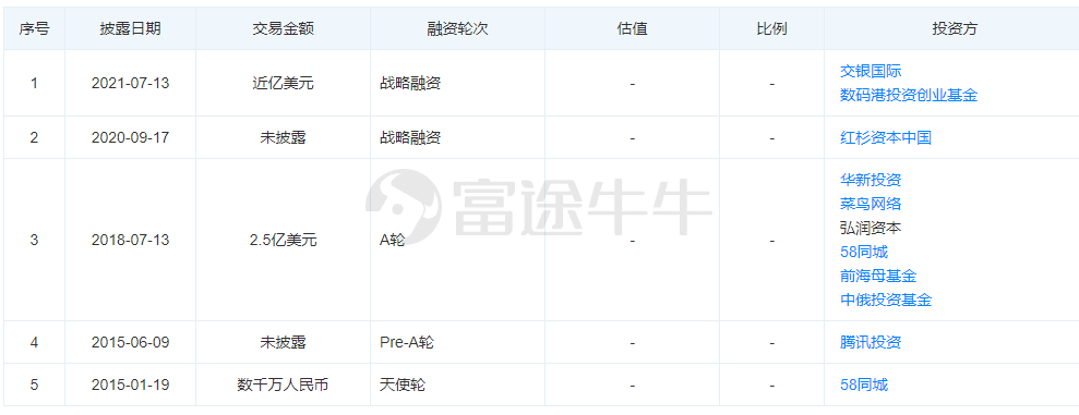 天眼查数据显示,IPO前公司历经数轮融资,投资方包括交银国际、红杉资本中国、腾讯投资、58同城、中俄投资基金、菜鸟网络、华新投资等。