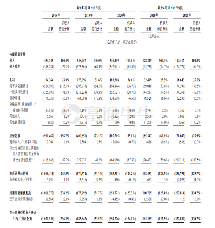 财务方面,于2018年、2019年及2020年,公司的收入分别为4.531亿元、5.485亿元及5.304亿元,毛利润分别为1.044亿元、1.731亿元及1.834亿元,同期毛利率分别为23.0%、31.6%及34.6%。同期公司的经调整亏损净额分别为7.84亿元、3.969亿元及1.854亿元。