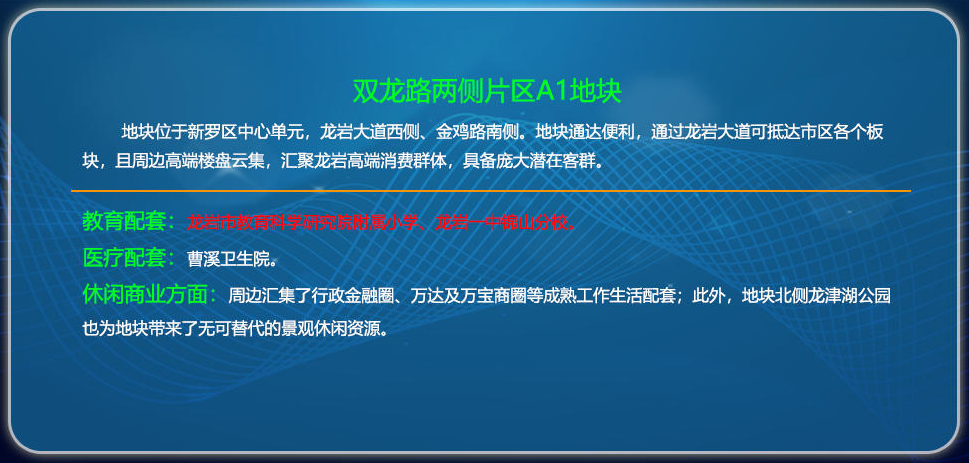 环龙津湖区域计划出让5宗地块,分别是龙津湖D东地块、龙岩大道东片区E地块、双龙路两侧片区A1地块、洋潭片区6号地块、联通大厦北侧地块。