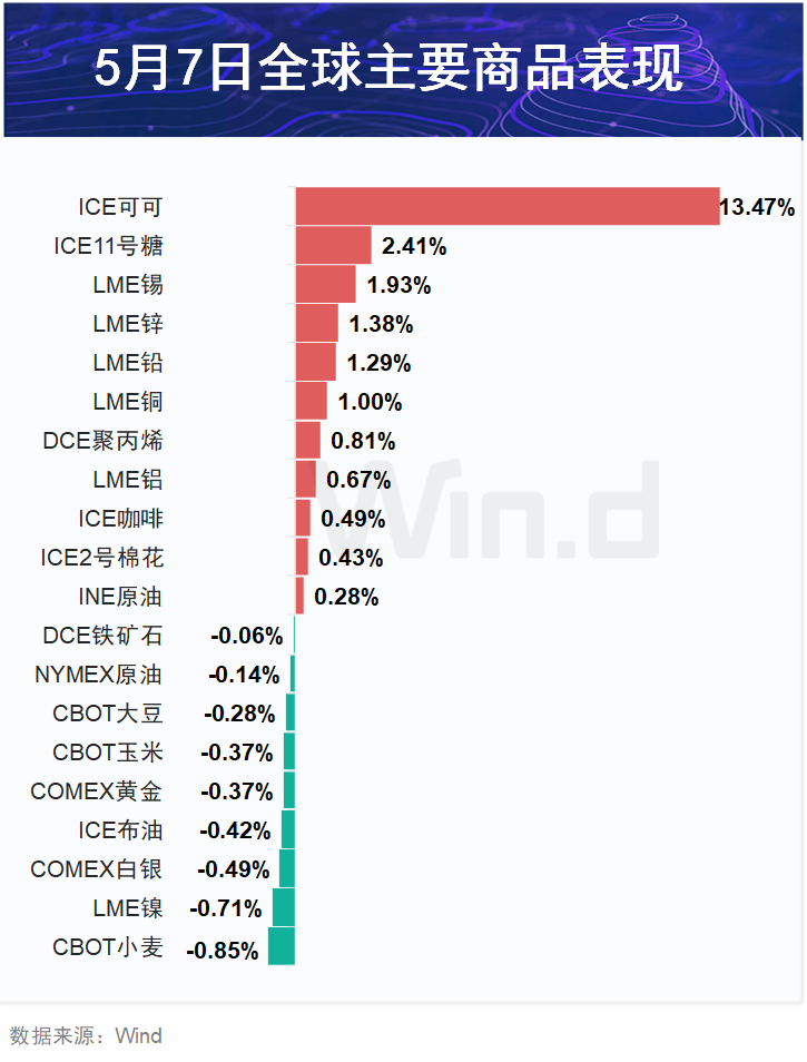 纽约可可豆期货主力合约一度涨超14.3%,创1960年以来最大盘中涨幅,徘徊于日高8674美元/吨附近。上周跌23%,创1959年以来最大单周跌幅;周一(5月6日),在交投清淡中进一步走低。伦敦可可期货涨6.60%。