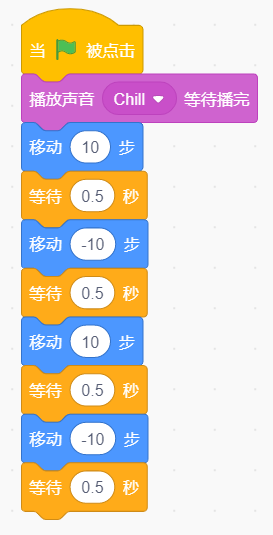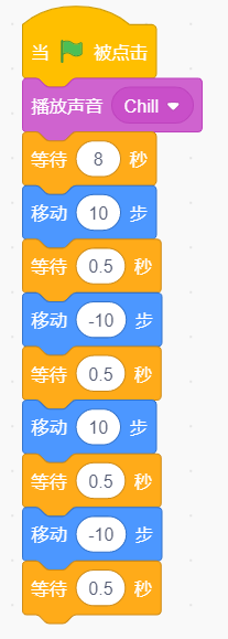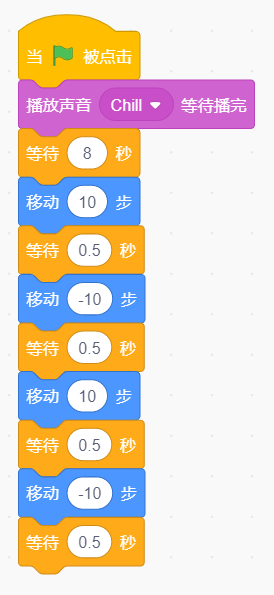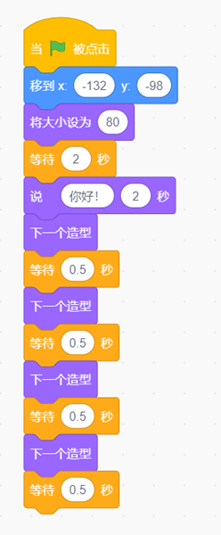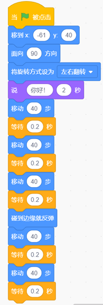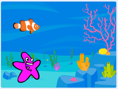 1.准备工作 (1)背景:Underwater 1; (2)角色:Fish、Starfish。 2.功能实现 (1)如上图所示设置Fish初始位置为舞台上方的左侧,面向右;设置Starfish初始位置在舞台左下方; (2)点击绿旗Fish先说“你好!” 2秒后,Starfish说“你好!” 2秒; (3)Fish一直游到舞台边缘,碰到边缘时就往回走,注意肚皮不能朝上; (4)Starfish不动,每过0.5秒切换一次造型; (5)添加背景音乐“Bubbles”,播放背景音乐。 |