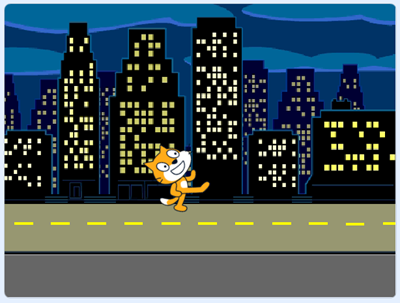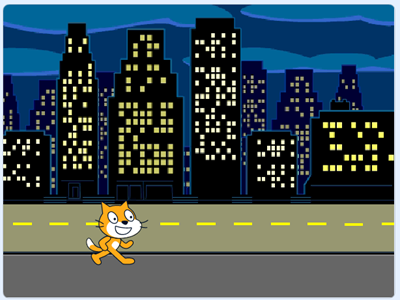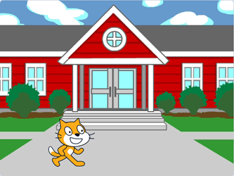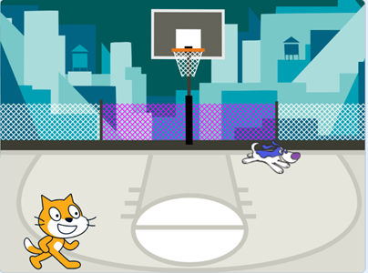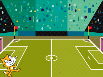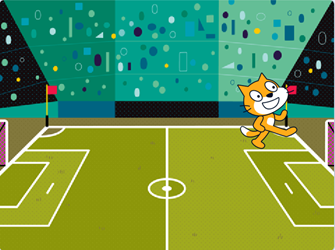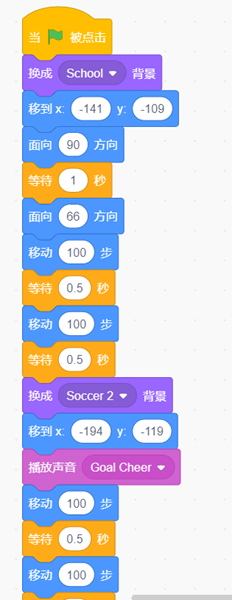37. | 小猫当裁判 1.准备工作: (1)背景:School、Soccer2; (2)角色:小猫 。 2.功能实现: (1)设置小猫初始位置如下图所示,初始方向为右; ![]() (2)设置初始背景为School; (3)点击绿旗,等待1秒后,小猫面向学校,走到学校门口,切换背景Soccer2; ![]() (4)切换成Soccer2后,小猫位置在左下角; ![]() (3)小猫进入Soccer2,播放声音Goal Cheer; (4)调整小猫面向方向,朝着右上角的小红旗走去,最后停在小红旗处。 ![]() |