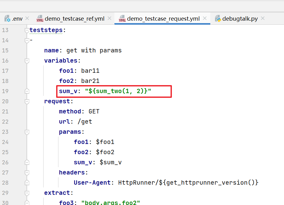 如图,debugtalk里写了sum_two函数,yaml文件中采用${sum_two(1, 2)}方式调用,sum_v的值即为3。