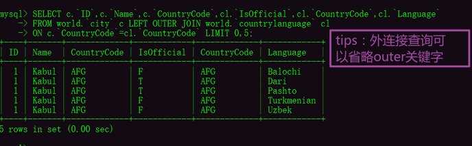 MySQL中的左外连接查询查询关键字:LEFT OUTER JOINSELECT c.ID,c.Name,c.CountryCode,cl.IsOfficial,cl.CountryCode,cl.Language