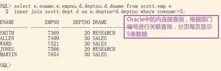 inner join scott.dept d on e.deptno=d.deptno where rownum<=5;