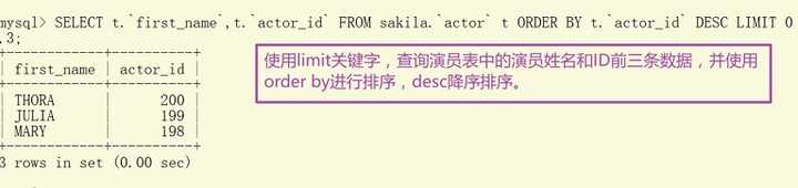 MySQL中的分页limit关键字通过limit关键字实现,根据sakila数据库中的actor(演员表)为例子返回最后三条记录,使用actor_id进行排序。注意:limit属于MySQL扩展SQL92后的语法,在其它数据库中不能通用。Oracle的分页可以通过rownum来实现,上面也介绍了。SELECT t.first_name,t.actor_id FROM sakila.actor t ORDER BY t.actor_id DESC LIMIT 0,3;
