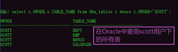 1.2、Oracle中的联合查询示例主要以SCOTT用户作为示例,查看SCOTT用户下有哪些表,这种方式需要以dba管理员身份运行SQL语句查询:ower代表了用户名,所以直接查找SCOTT用户,TABLE_NAME:代表了表名。select t.OWNER,t.TABLE_NAME,t.TABLESPACE_NAME from dba_tables t where t.OWNER=‘SCOTT’;