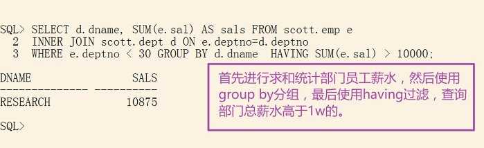 WHERE e.deptno < 30 GROUP BY d.dname HAVING SUM(e.sal) > 10000;