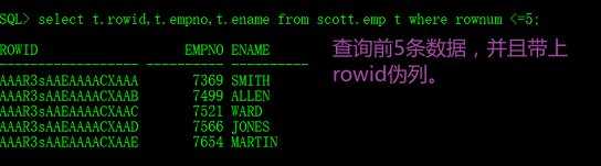 分页查询示例:使用rownum关键字进行演示Oracle中的分页查询。查询scott用户中emp(员工表)的员工empno:编号、ename:员工姓名以及伪列rowid,只查询前5条数据:SQL> select t.rowid,t.empno,t.ename from scott.emp t where rownum <=5;