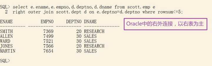 right outer join scott.dept d on e.deptno=d.deptno where rownum<=5;