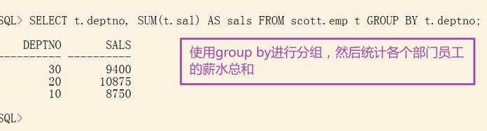 2、着重掌握的函数group by函数用于分组;having函数用于过滤,对分组后内容进行过滤。group by函数配合聚合函数sum使用,查询Oracle中scott用户下的emp表。使用group by进行分组,然后统计公司各部门员工的薪资:SELECT t.deptno, SUM(t.sal) AS sals FROM scott.emp t GROUP BY t.deptno;