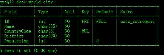 union和union all是有区别的,我列举的例子进行了模糊匹配,没演示出来效果。使用union all后DBMS不会取消重复的行。去掉后面的like条件,使用union统计的数据为14行,使用union all统计的数据为19行,其实不难理解,all就是全部。2、分页查询2.1、MySQL的分页查询使用limit关键字tips:Windows中CMD命令窗口使用color a即可调用出黑色背景绿色字体,color f0则是快速调出白色背景黑色字体哟!护眼色:R:181 G:230 B:181示例:使用world数据库中city表进行演示分页查询,通过desc展示数据结构,尤其是配合开发进行联调的时候很常用:mysql> desc world.city;