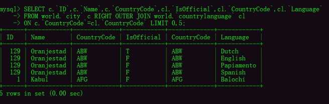 ON c.CountryCode=cl.CountryCode LIMIT 0,5;