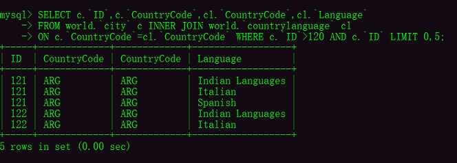 ON c.CountryCode=cl.CountryCode WHERE c.ID>120 AND c.ID LIMIT 0,5;