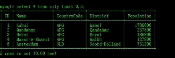 查询world数据库中的city表前5条数据:mysql> select * from city limit 0,5;