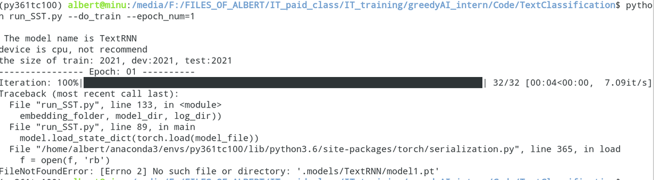 Traceback (most recent call last):File "run_SST.py", line 118, in embedding_folder, model_dir, log_dir))File "run_SST.py", line 44, in maintrain_iterator, dev_iterator, test_iterator = load_sst2(config.data_path, text_field, label_field, config.batch_size, device, config.glove_word_file, config.cache_path)File "/media/F:/FILES_OF_ALBERT/IT_paid_class/IT_training/greedyAI_intern/Code/TextClassification/Utils/SST2_utils.py", line 12, in load_sst2fields=[('text', text_field), ('label', label_field)])File "/home/albert/anaconda3/envs/py361tc100/lib/python3.6/site-packages/torchtext/data/dataset.py", line 78, in splitsos.path.join(path, train), **kwargs)File "/home/albert/anaconda3/envs/py361tc100/lib/python3.6/site-packages/torchtext/data/dataset.py", line 251, in __init__with io.open(os.path.expanduser(path), encoding="utf8") as f: