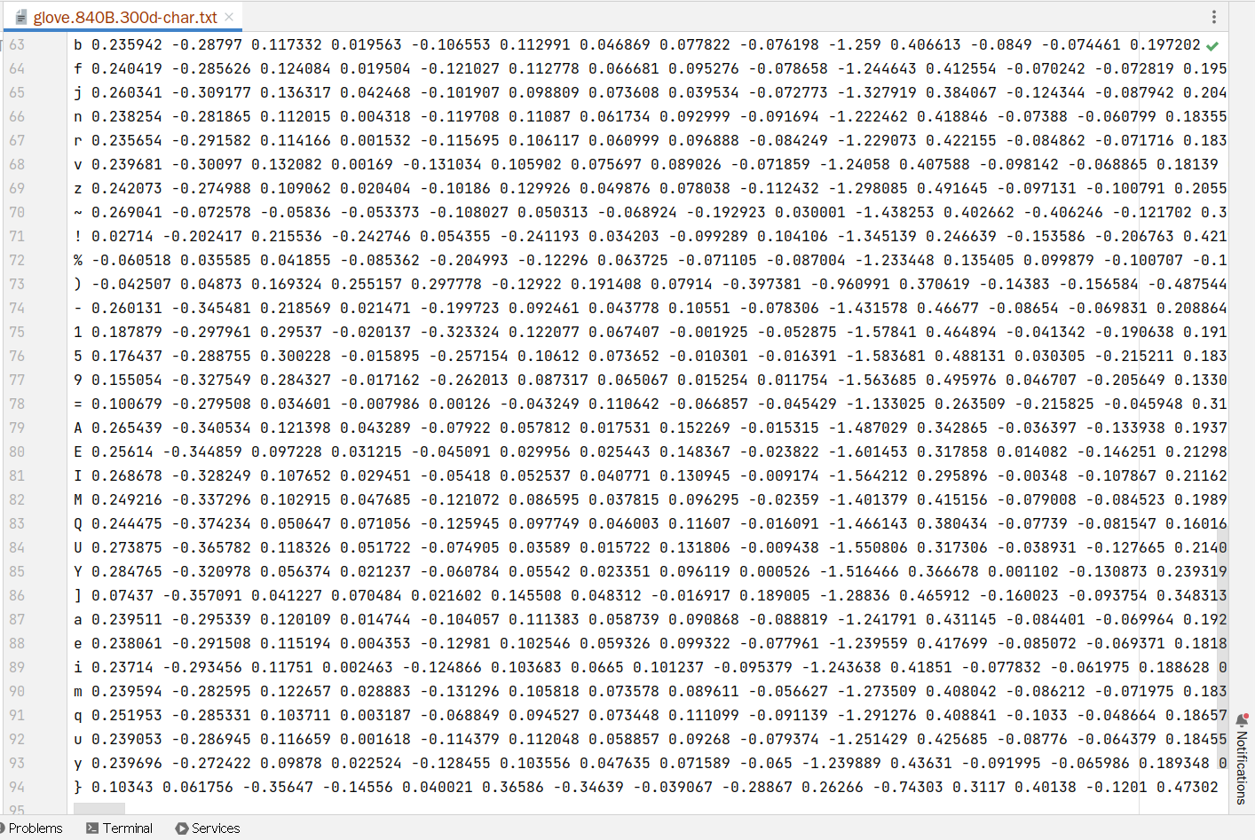 "glove.840B.300d-char.txt"这个文件,不同于"glove.840B.300d.txt"。它进行向量化,要表示的不是 is of apple tree这种单词,而是组成单词(word)的那些character(实际就是letter,就是组成单词的字母)。实际上就是 26个大写字母和26个小写字母以及一些标点符号,这些东西加起来一共94个。所以"glove.840B.300d.txt"里面有94行数据,每行表示一个字母或标点对应的向量表示,向量表示 用300个维度的数字来表示一个字母