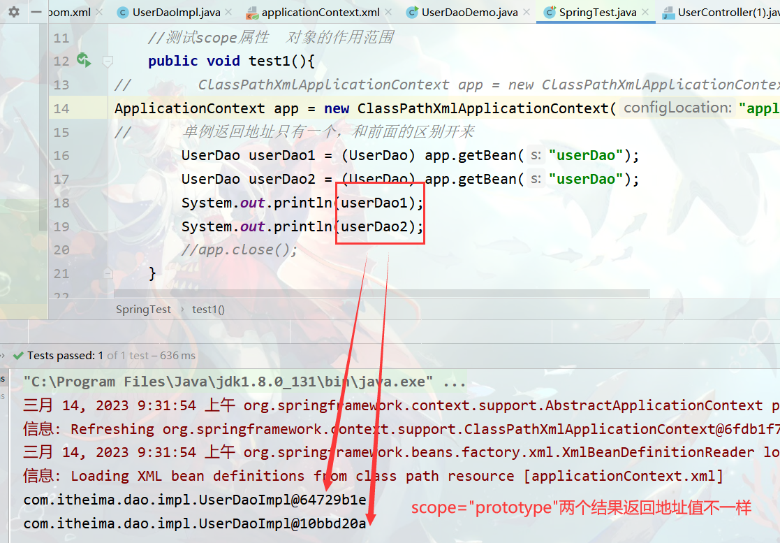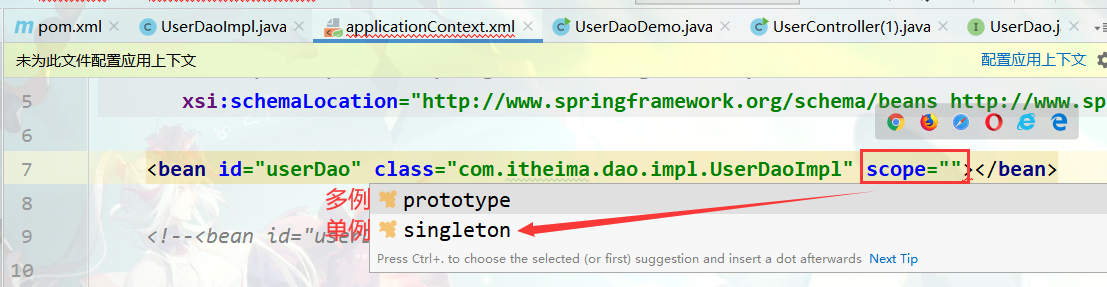 scope属性:Bean的作用范围,常用是Singleton(默认)和prototype