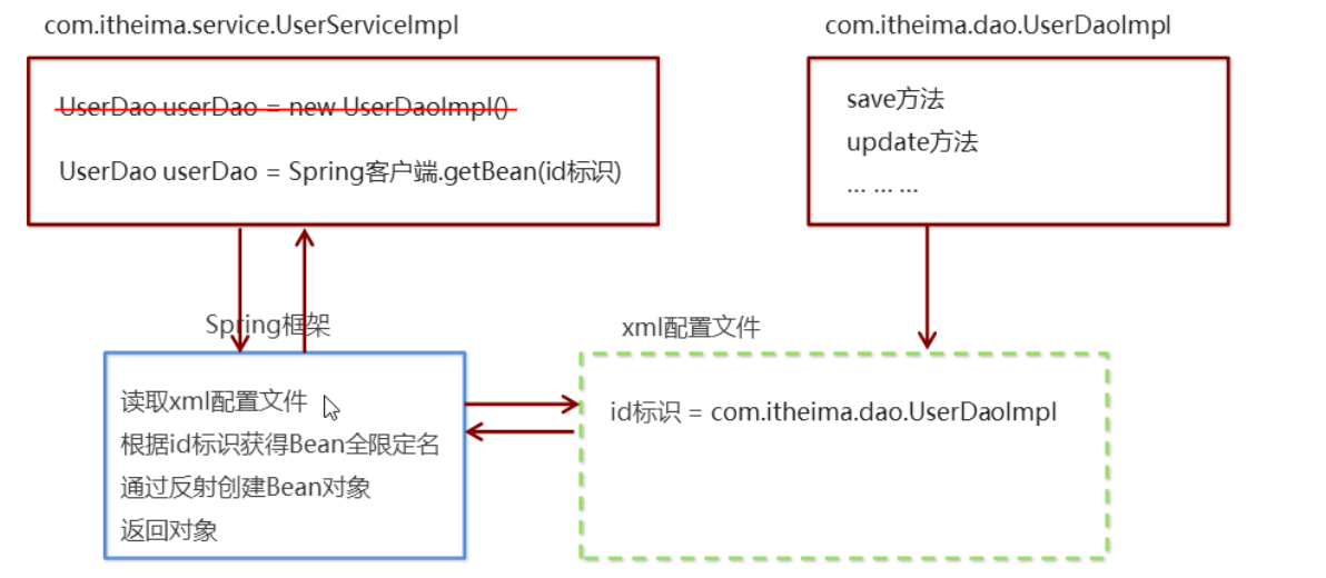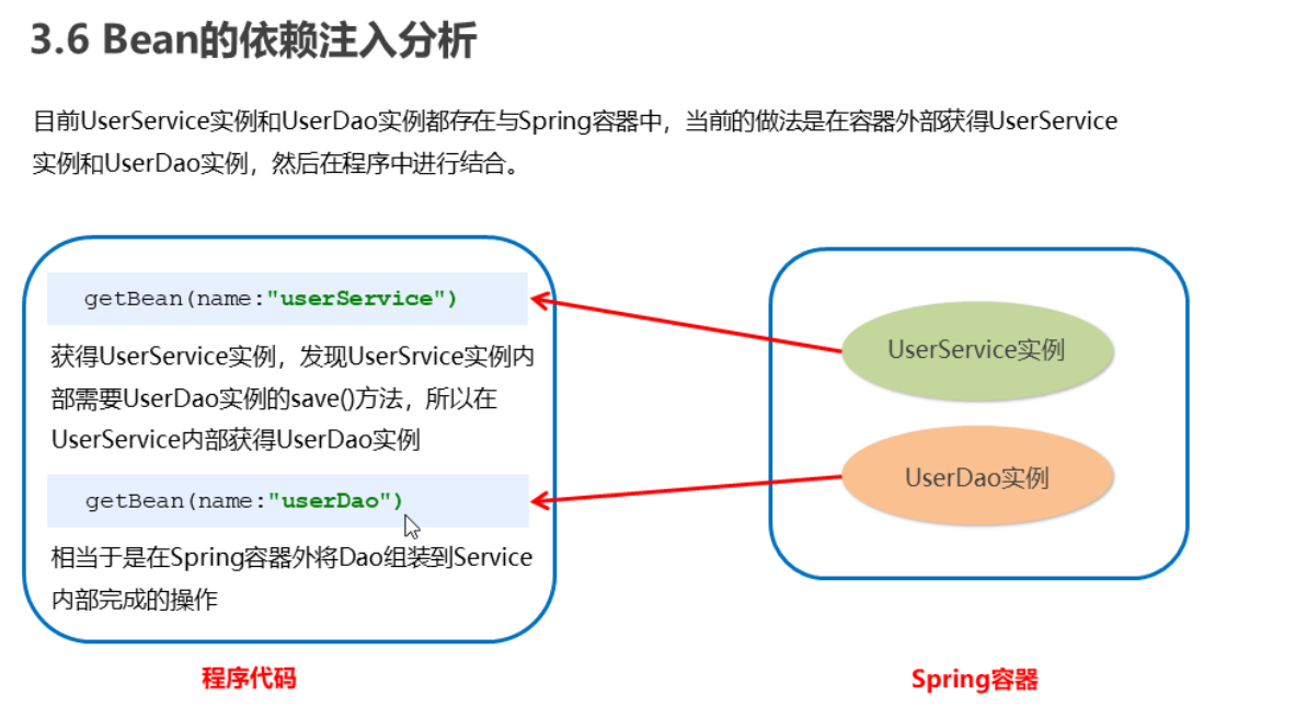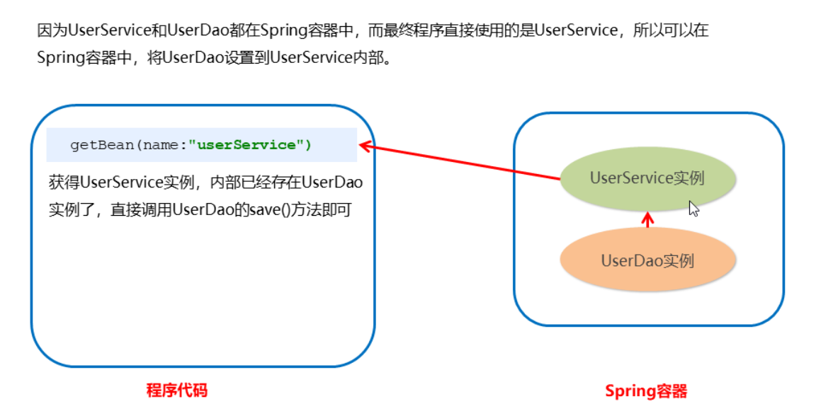 public class UserServiceImpl implements UserService {@Overridepublic void save() {ApplicationContext applicationContext = new ClassPathXmlApplicationContext("applicationContext.xml"); UserDao userDao = (UserDao) applicationContext.getBean("userDao"); userDao.save();}}ApplicationContext applicationContext = new ClassPathXmlApplicationContext("applicationContext.xml");UserService userService = (UserService) applicationContext.getBean("userService");userService.save();依赖注入(Dependency Injection):它是 Spring 框架核心 IOC 的具体实现。