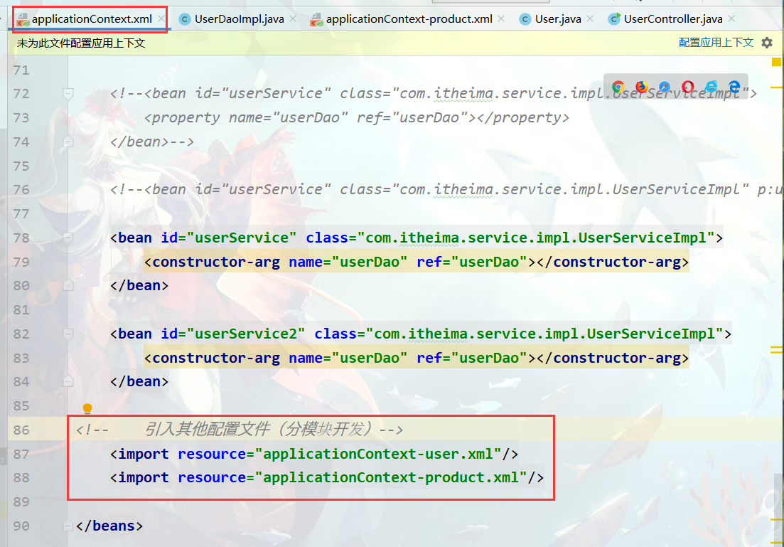 实际开发中,Spring的配置内容非常多,这就导致Spring配置很繁杂且体积很大,所以,可以将部分配置拆解到其他配置文件中,而在Spring主配置文件通过import标签进行加载