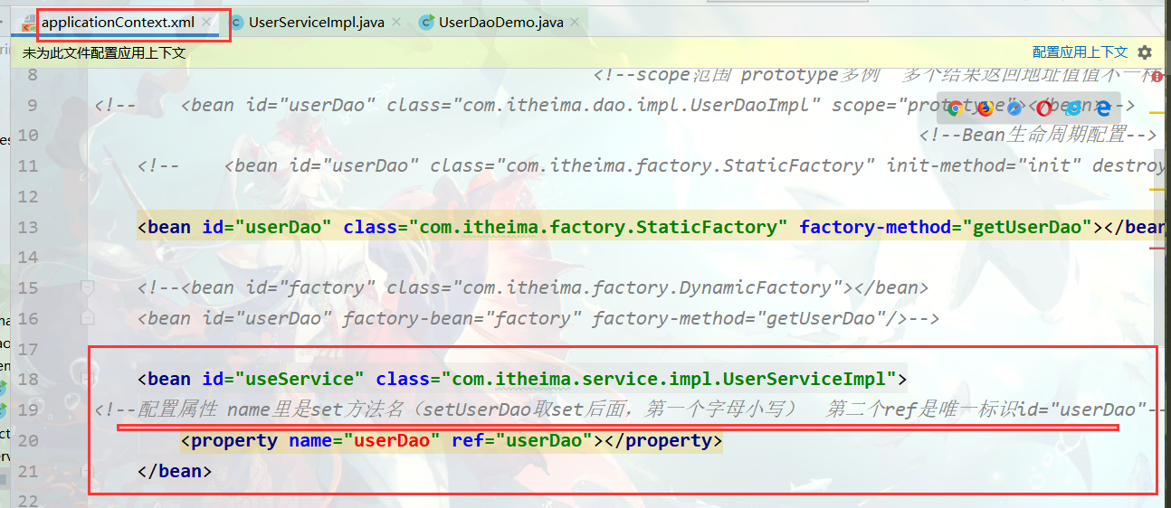 public void test1(){ApplicationContext applicationContext = new ClassPathXmlApplicationContext("applicationContext.xml");UserDao userDao = (UserDao) applicationContext.getBean("userDao"); userDao.save();}3. Spring配置文件