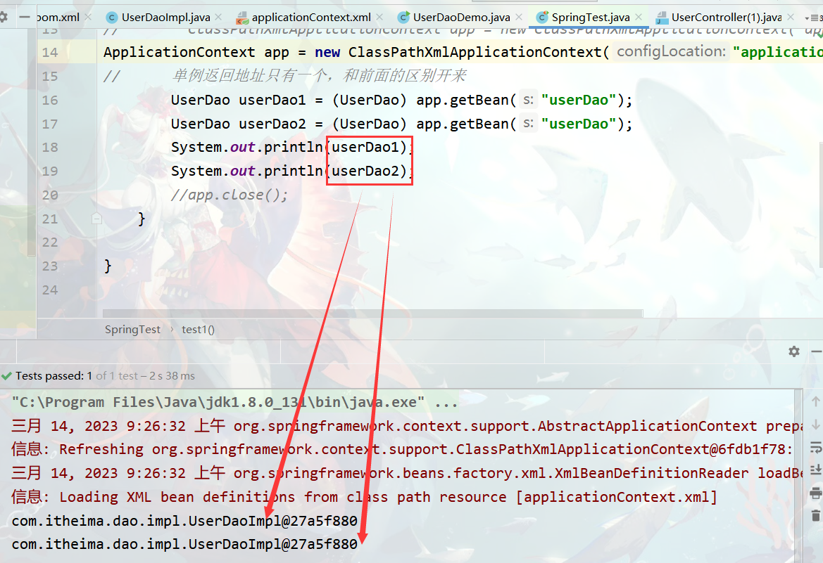 ApplicationContext applicationContext = new ClassPathXmlApplicationContext("applicationContext.xml"); UserService userService1 = (UserService) applicationContext.getBean("userService"); UserService userService2 = applicationContext.getBean(UserService.class);