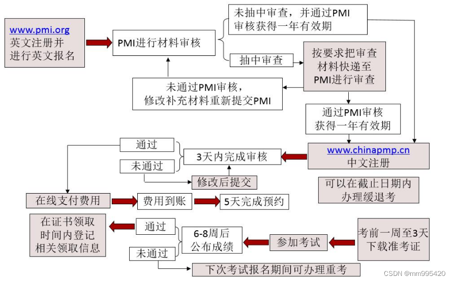 3、等待材料审核通过。期间考生还有可能会抽中资格审查,届时需要将对应纸质材料邮寄给PMI指定地点进行审查,审查成功后获得一年有效期。考生需要在这一年有效期内完成PMP®考试中文报名。