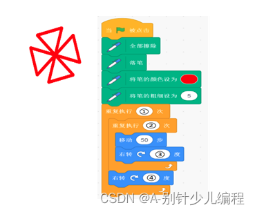 *1.要使以下代码运行后画出如图所示三角形风车,则以下代码中0234处应分别填入多少