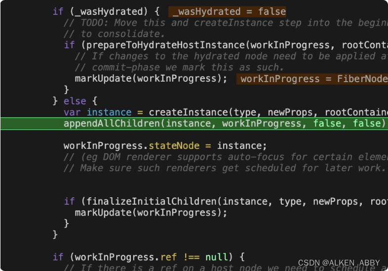 - 当创建完dom 节点后,会通过 appendAllChildren 函数 将这个节点插入到到之前已经创建好的dom树中。