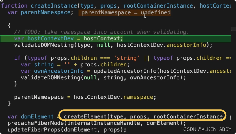- 首先会判断 current 是否存在,首次渲染时 current 是不存在的,接下来会为 hostcomponent 对应的 fiber 节点创建对应的 DOM 节点,进入 createInstance 函数: