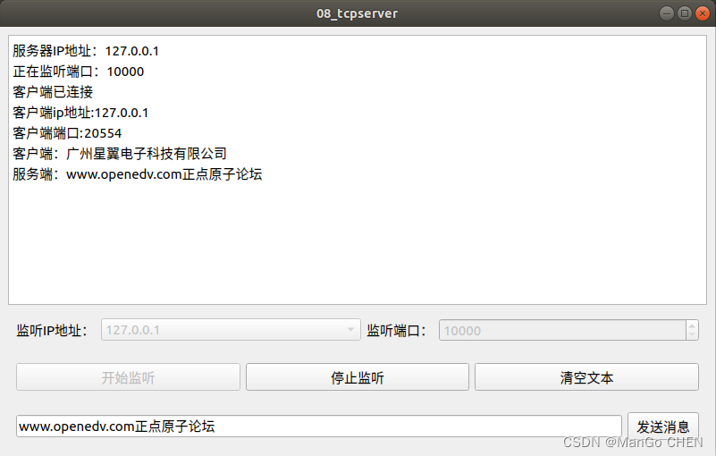 地的主机 IP 地址和端口,同时等待服务端的连接。此程序需要结合客户端一起使用。
