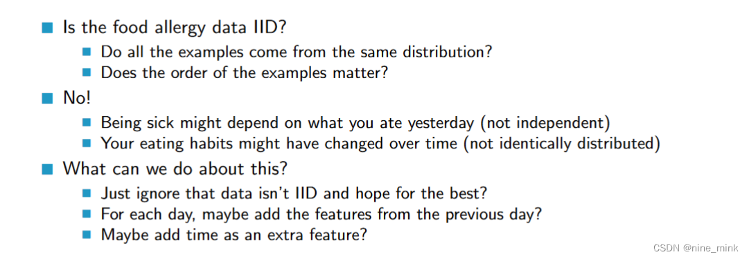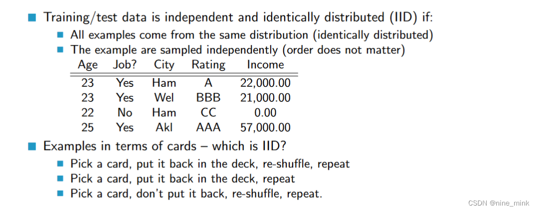 在机器学习中,我们通常将数据集中的每个样本视为独立同分布(IID)的。这意味着每个样本都来自于同一分布,并且与其他样本之间是独立的。