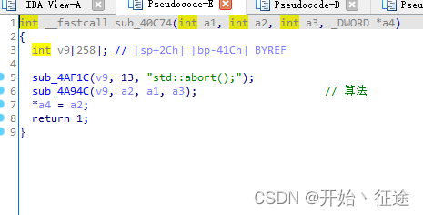 进到45258函数,可以看到很清晰的算法逻辑,先循环后判断,以及byte_A8740的值,可以很容易判断出,这是一个base64