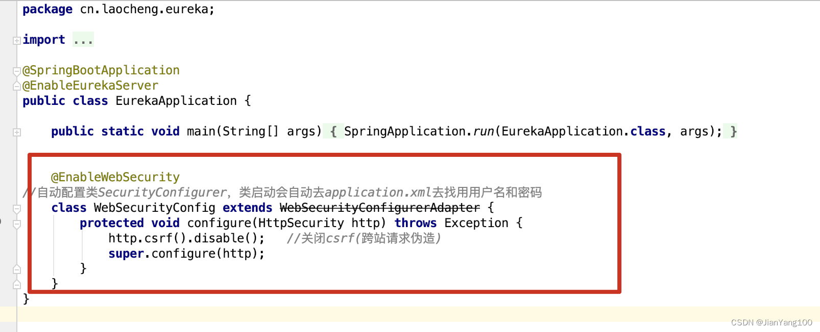 //自动配置类SecurityConfigurer,类启动会自动去application.xml去找用用户名和密码class WebSecurityConfig extends WebSecurityConfigurerAdapter {protected void configure(HttpSecurity http) throws Exception {http.csrf().disable(); //关闭csrf(跨站请求伪造)super.configure(http);}}