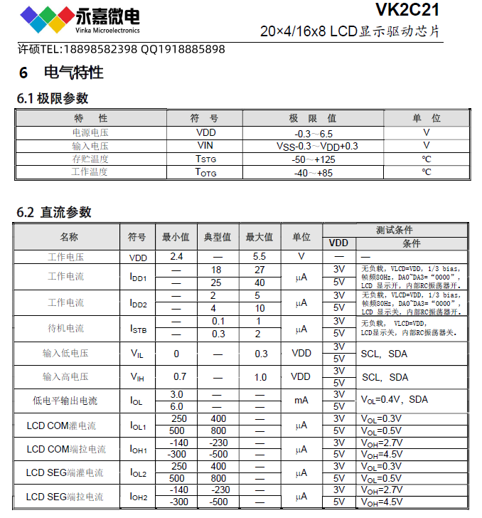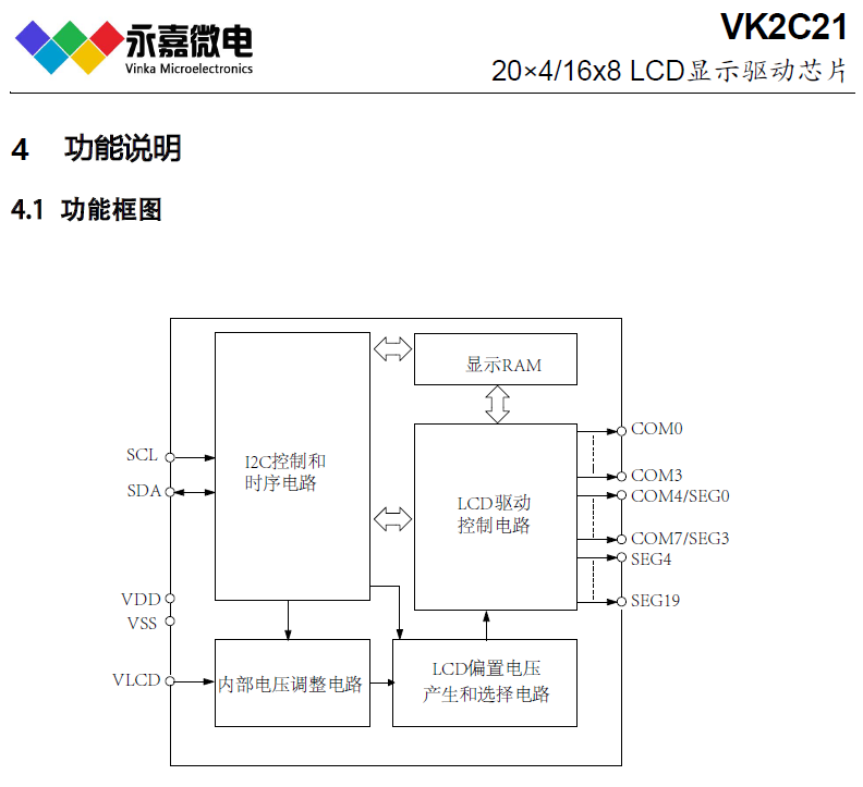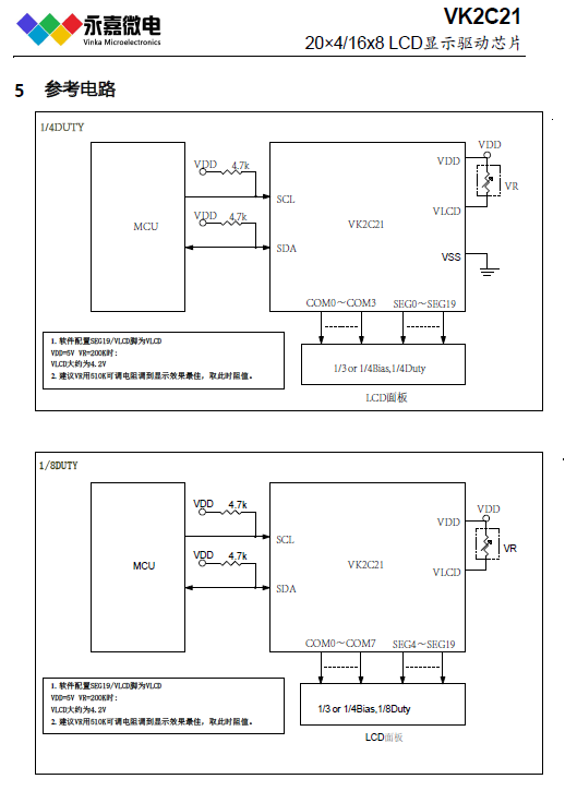 VK2C21是一个点阵式存储映射的LCD驱动器,可支持最大80点(20SEGx4COM)或者最大128点(16SEGx8COM)的LCD屏。单片机可通过I2C接口配置显示参数和读写显示数据,也可通过指令进入省电模式。其高抗干扰,低功耗的特性适用于水电气表以及工控仪表类产品。