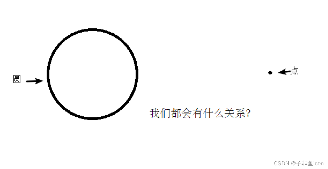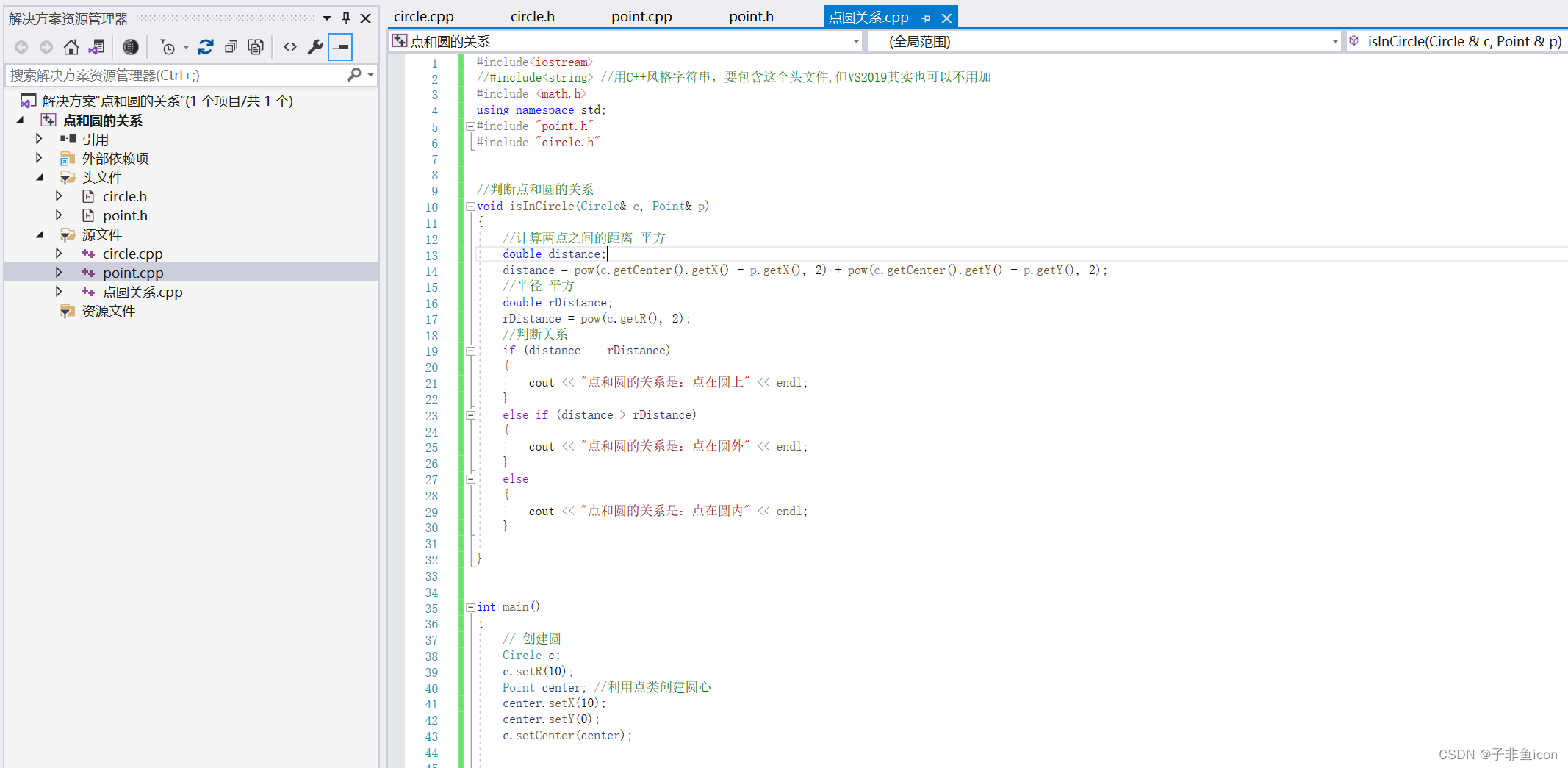 {//计算两点之间的距离 平方double distance;distance = pow(c.getCenter().getX() - p.getX(), 2) + pow(c.getCenter().getY() - p.getY(), 2);//半径 平方double rDistance;rDistance = pow(c.getR(), 2);//判断关系if (distance == rDistance){cout << "点和圆的关系是:点在圆上" << endl;}else if (distance > rDistance){cout << "点和圆的关系是:点在圆外" << endl;}else{cout << "点和圆的关系是:点在圆内" << endl;}}int main()