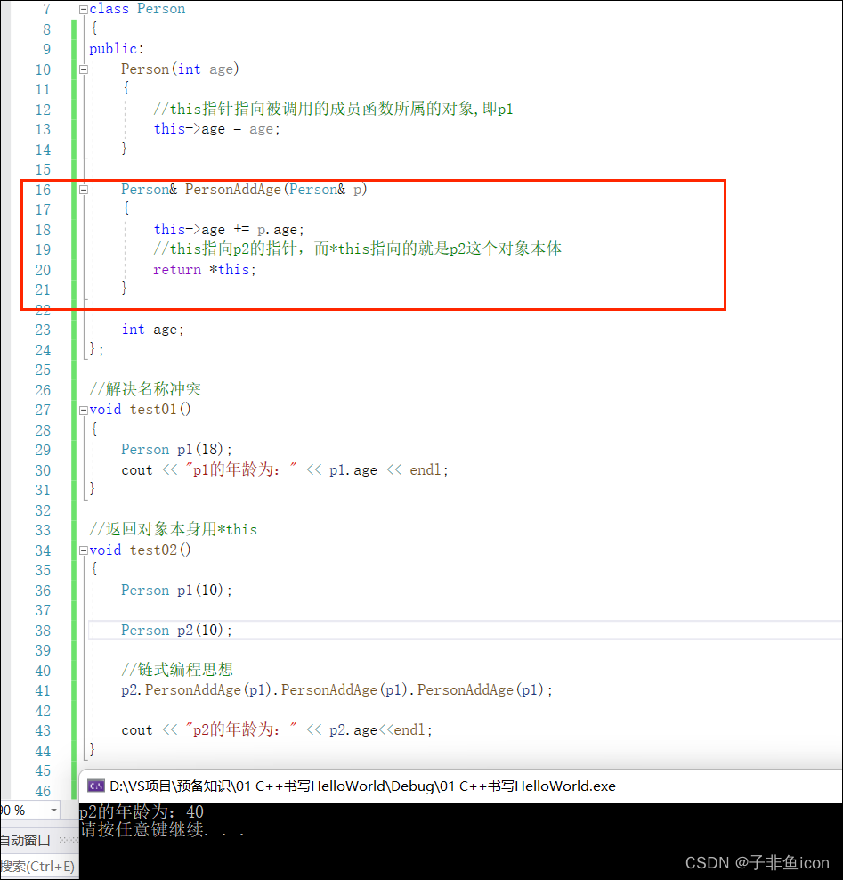 {Person p1(10);Person p2(10);//链式编程思想p2.PersonAddAge(p1).PersonAddAge(p1).PersonAddAge(p1);cout << "p2的年龄为:" << p2.age<//test01();test02();system("pause");return 0;