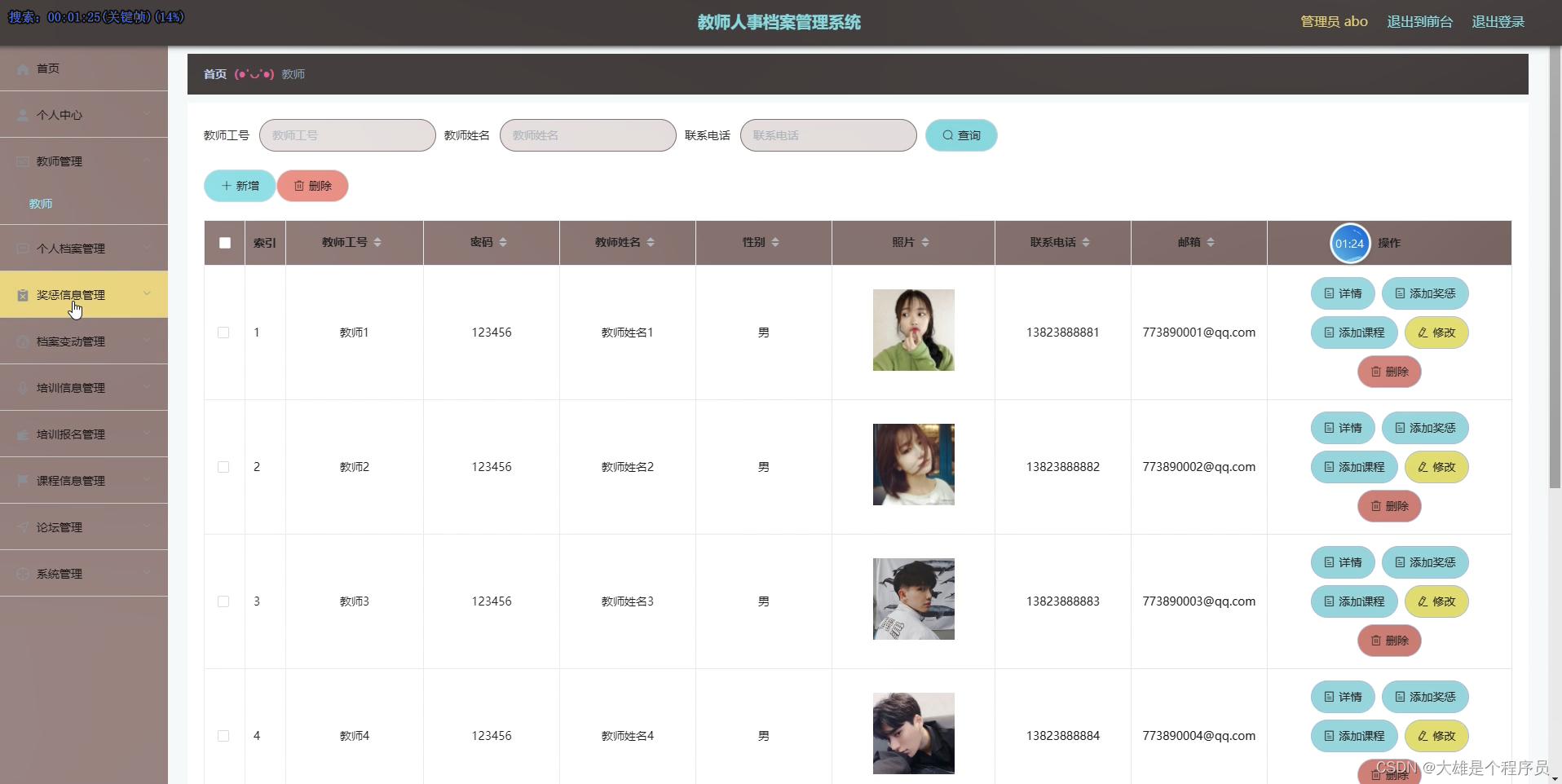 教师人事档案管理系统采用B/S结构、java开发语言、以及Mysql数据库、Spring Boot框架等技术。系统主要分为管理员和教师两部分,管理员主要功能包括:首页、个人中心、教师管理、个人档案管理、奖惩信息管理、档案变动管理、培训学校管理、培训报名管理、课程信息管理、论坛管理、系统管理等。教师个人后台管理主要包括:首页、个人中心、个人档案管理、奖惩信息管理、档案变动管理、培训报名管理、课程信息管理、我的收藏管理,前台管理主要包括:首页、培训信息、系统公告、个人中心、后台管理、客服等功能,基本上实现了整个,教师人事档案管理系统信息管理的过程。本系统在一般教师人事档案管理系统的基础上增加了首页培训信息最新信息的功能方便教师快速浏览,是一个高效的、动态的、交互友好的教师人事档案管理系统。