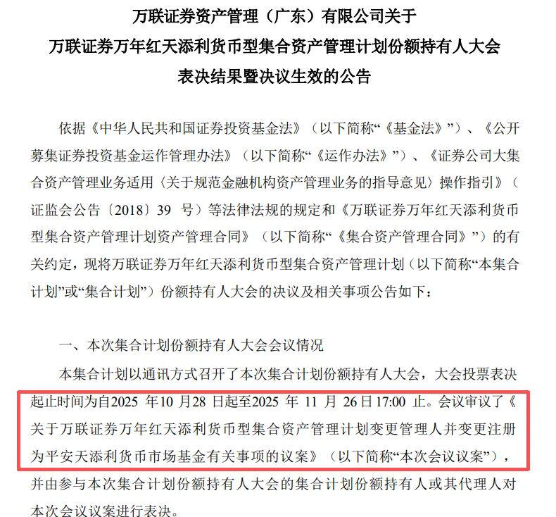 11月28日,万联证券公告称,旗下万联天添利货币资管计划经份额持有人大会表决,同意变更管理人为平安基金,更名为“平安天添利货币市场基金”。