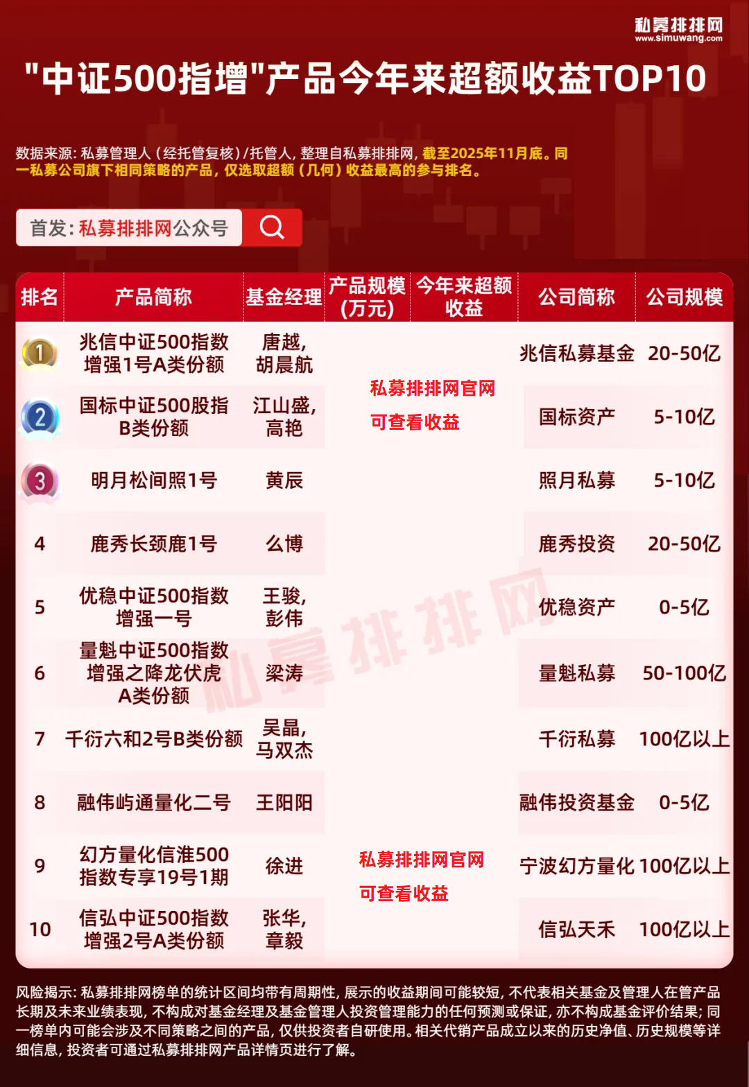 兆信私募基金唐越和胡晨航共同管理的“兆信中证500指数增强1号A类份额”,今年来超额收益达%,位居榜首。资料显示,兆信基金是一家以研究为基础,灵活运用多元投资工具,不断优化资产组合风险收益比的具有多资产、多策略的私募证券投资基金。
