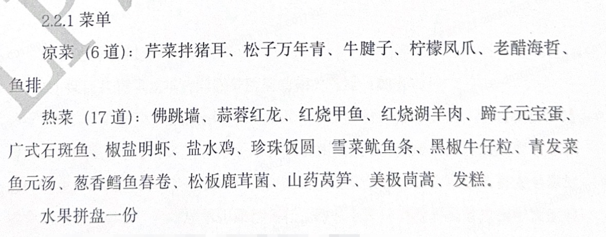 菜单显示,年会晚餐共有6道凉菜、17道热菜、1份水果拼盘,热菜中有佛跳墙、龙虾、甲鱼、石斑鱼等。