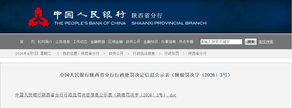 根据中国人民银行陕西省分行行政处罚决定信息公示表(陕银罚决字〔2026〕3号):