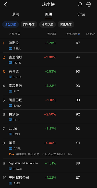 据富途牛牛美股交易热度榜显示,排名靠前的美股包括特斯拉、富途控股、英伟达、雾芯科技、阿里巴巴、拼多多等。