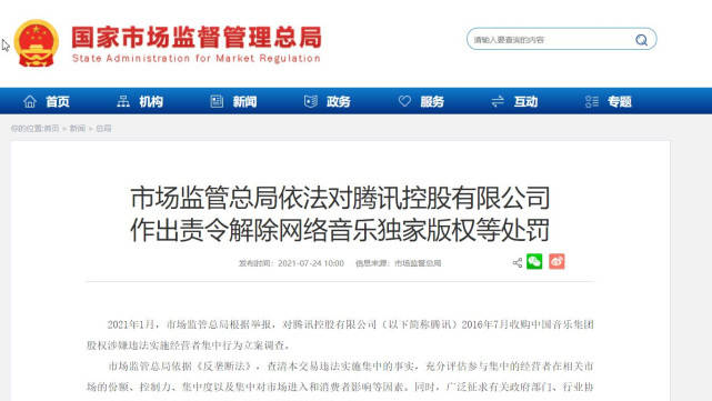 2021年7月24日,针对音乐平台的独家版权问题,国内市场监管总局正式发出通报,要求腾讯音乐娱乐集团,在30天的时限内解除网络独家版权,将音乐资源共享给其它平台。