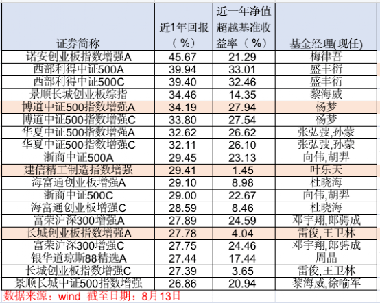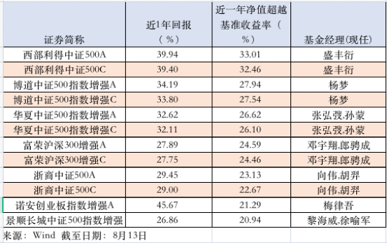 Wind数据显示,截至8月13日,在可统计收益的189只(A/C份额分开统计)指数增强基金中,近一年收益排名前三的是诺安创业板指数增强A、西部利得中证500A、西部利得中证500C,分别获得45.67 %、39.94 %、39.40 %的回报。此外,景顺长城创业板综指、博道中证500指数增强A/C、华夏中证500指数增强A/C近1年回报也均在30 %以上。