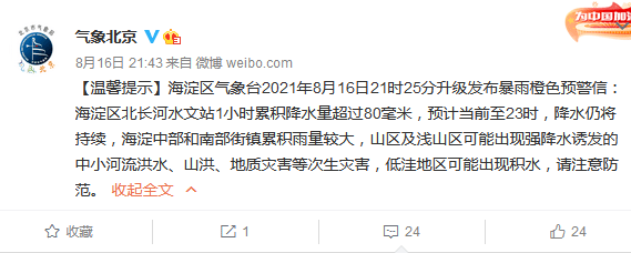 海淀区气象台2021年8月16日21时25分升级发布 暴雨橙色预警信:海淀区北长河水文站1小时累积降水量超过80毫米,预计至23时,降水仍将持续,海淀中部和南部街镇累积雨量较大,山区及浅山区可能出现强降水诱发的中小河流洪水、山洪、地质灾害等次生灾害,低洼地区可能出现积水,请注意防范。