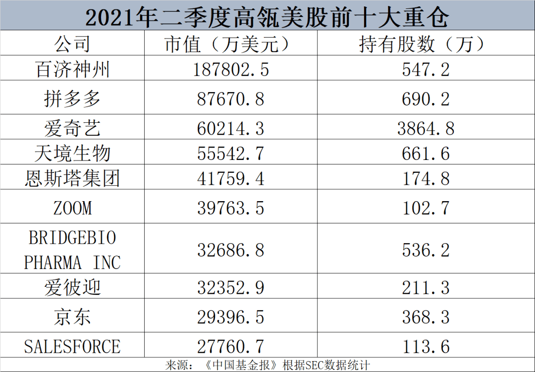 高瓴2季末前十大重仓股合计持有市值达58.5亿美元(约合人民币385亿元),占高瓴美股持仓市值61%的比重。