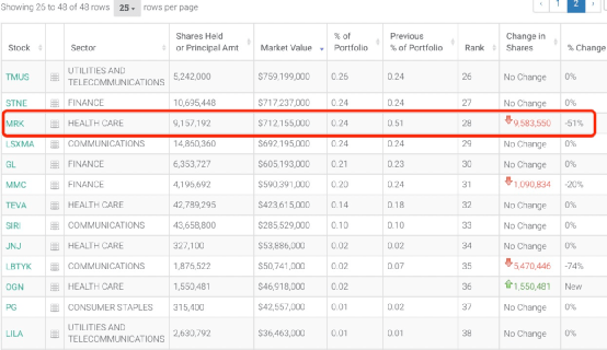 二季度前五大卖出股中,头号卖出股是医药巨头默克,持股份额腰斩,减持股份比例达51%。此外,伯克希尔还大幅减持通用汽车,使其跌出十大重仓股,大举减持美国合众银行,使其成为二季度末的第八大重仓股。